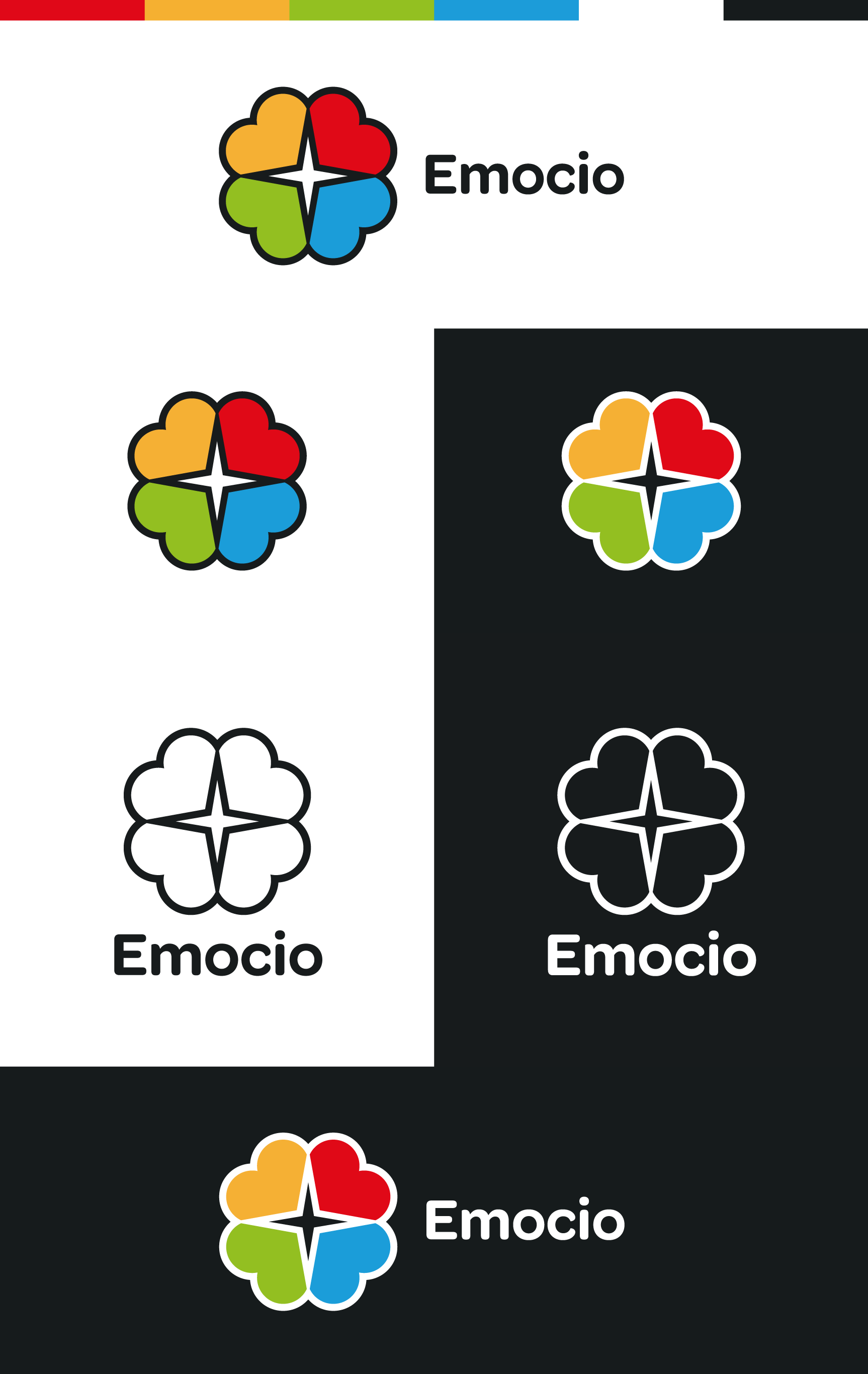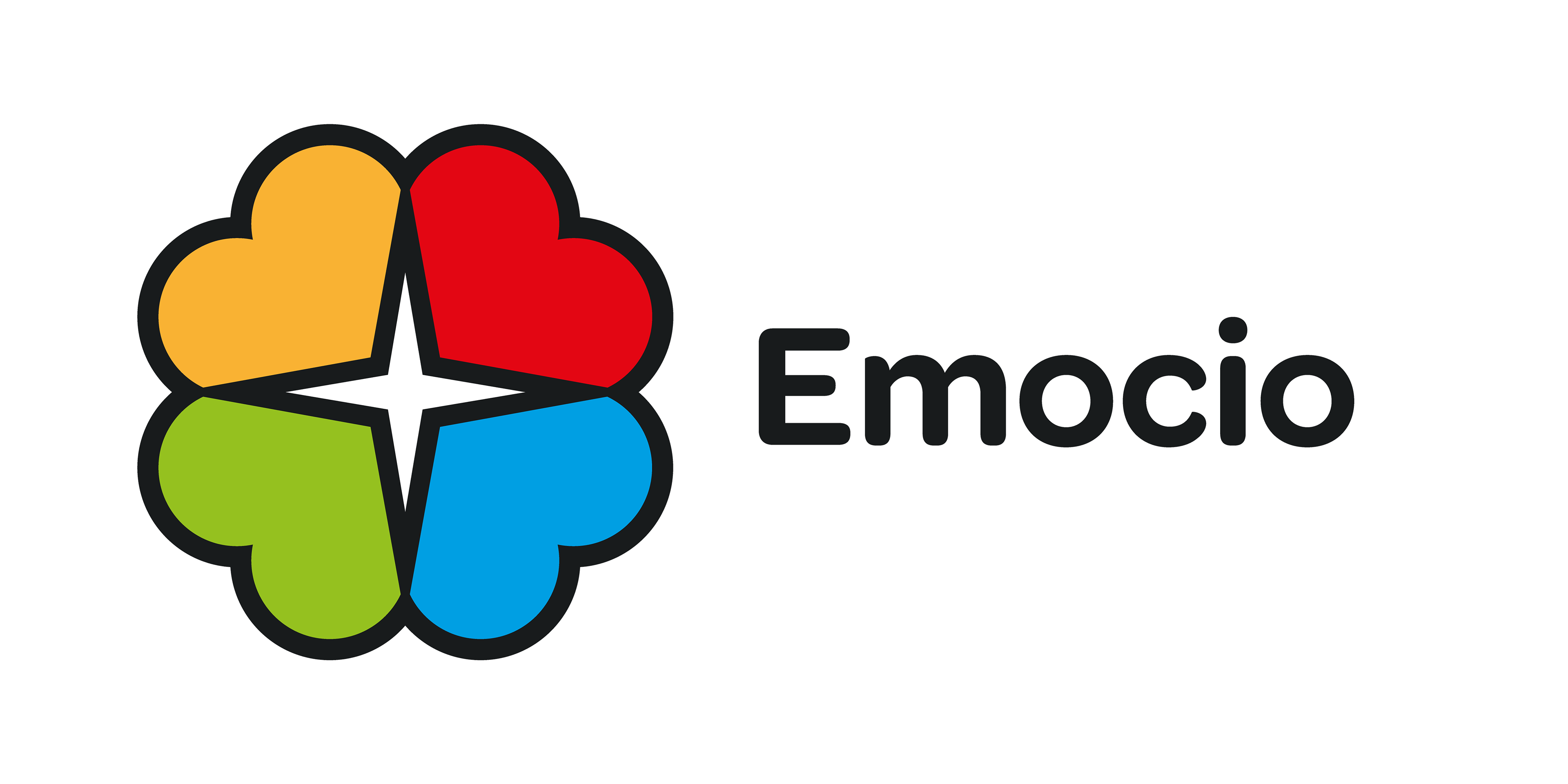 EN-US: The Emocio brand is made up of a Symbol (graphic symbol) and a Logo (typographic symbol). The graphic representation of the Symbol is made up of four rotated heart symbols, together forming the image of a colored four-leaf clover, with a compass rose in the center.